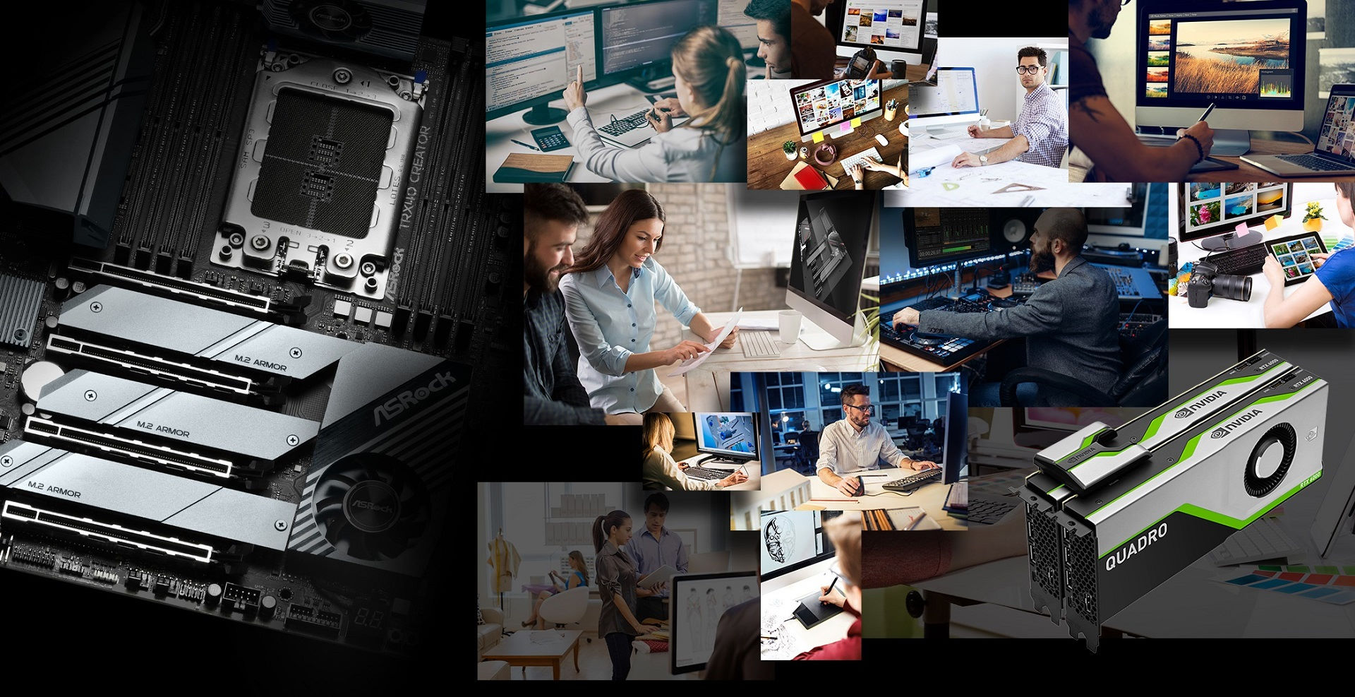 旗舰主板 – TRX40 Creator, 是为各领域2D、3D、剪辑、运算等等全方位内容创造者所设计。皆由AMD第三代Ryzen Threadripper处理器强大的核心数量、运算效能, 以及PCIe 4.0的高速与扩充性, 相信能够充分满足各设计师的操作情境与需求。当然, TRX40更支持nVidia Quadro系列绘图卡, 与Quadro SLI功能, 让VR (虚拟现实) 相关设计师们, 更加得心应手。