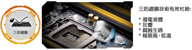 華擎獨家「三防鍍膜技術」在主機板PCB線路板表面塗蓋一層絕緣防護膜, 令包封的PCB可有效杜絕導電液體、灰塵、腐蝕生銹的損害, 輔助超頻順利進行, 讓超頻族群們在進行極低溫超頻時毋須憂心液態氮 (LN2) 或液態氦 (LHE) 凝結的水氣會流入主機板內, 中斷超頻遊戲甚而摧毀成功的果實;而這項全新防護技術, 除了是巔覆DIY組裝市場的業界創舉之外, 研發巧思更讓產品吸睛指數破表, 亦同時為想締造世界紀錄的超頻好手們指出最明智的主機板產品首選!