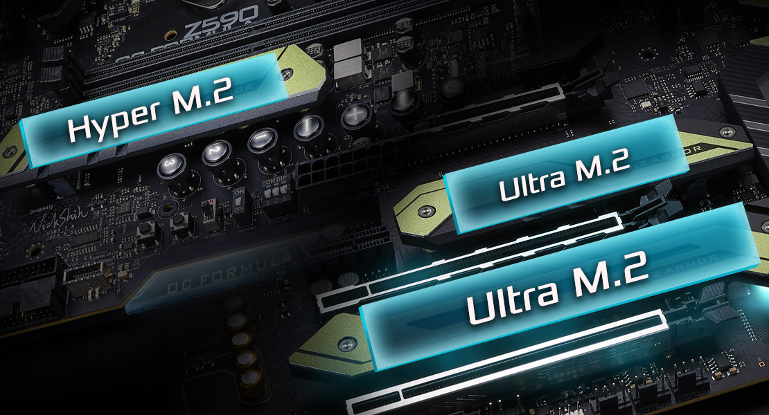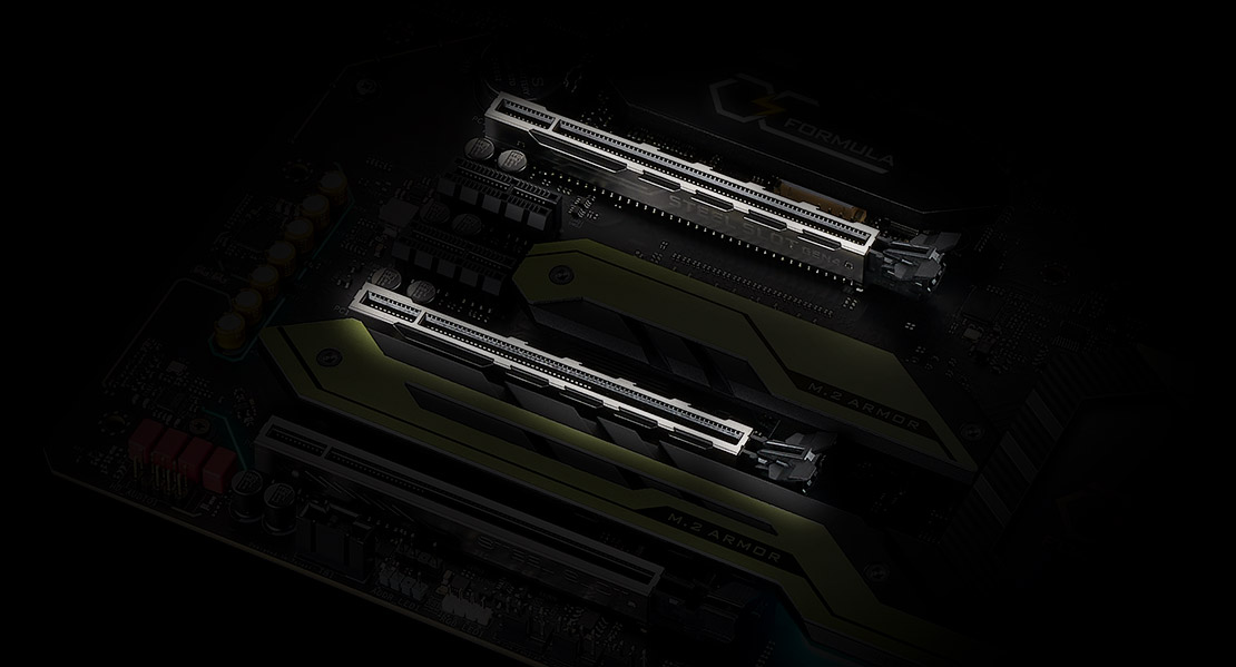 採用大面積的鋁合金鍛造散熱片能有效提高散熱效果。 散熱片下方是新一代 PCI Express 4.0 Hyper M.2 插槽,是前一代規格的雙倍傳輸速度。