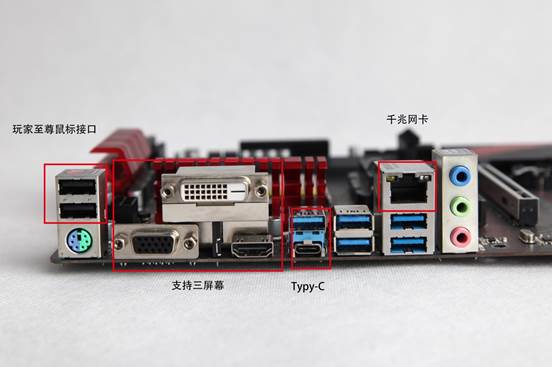 主板的I/O接口比较丰富,作为Gaming系列主板,定制的玩家至尊鼠标接口可以让普通的鼠标从 125Hz 到 1000Hz 自由调整个人偏好的鼠标回报率。三个显示输出接口搭配最新的APU不用单独再插显卡就可以实现三个显示器同时输出。同时还配有千兆网卡,降低游戏延迟。