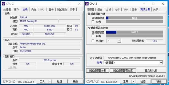 用CPU-Z自带测试软件对APU进行跑分测试,单线程为420,多线程为1688分。跑分成绩略比Intel i3 8100高一点。