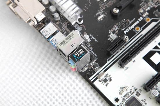 在音频模块,这块主板采用ELNA 专业音效电容,漏电流更低,底噪也越低,音质相对更为清澈纯净。