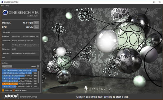 Cinebench R15测试:OpenGL为48.91fps,CPU为572cb。