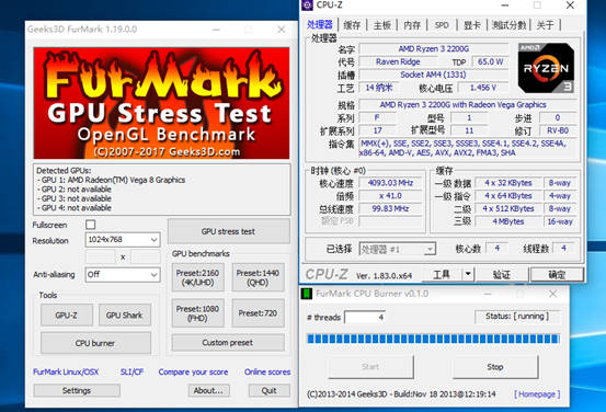 将APU超频到4.1GHz,打开Furmark进行压力测试,CPU稳定运行在4.1GHz。