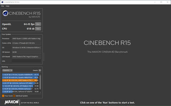 Cinebench R15测试:OpenGL为64.45fps,CPU为618cb。