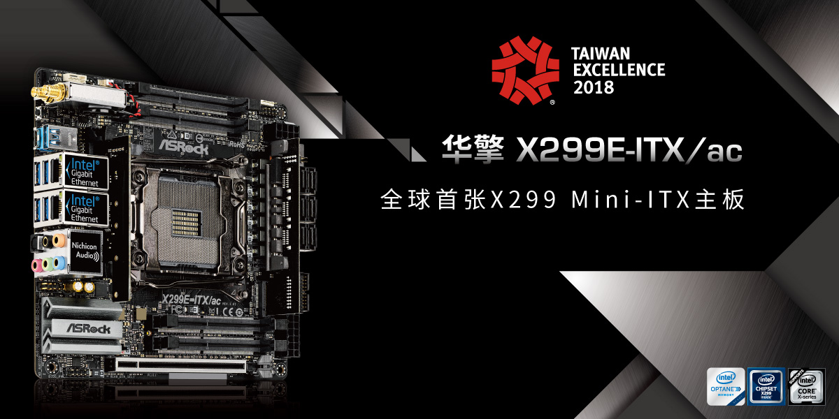 贺!全球主板领导厂商华擎科技一直专注在主板研发领域, 提供更优质、更耐用的主板。今年更荣获2018 年第 26 届台湾精品奖 (Taiwan Excellence Award) 肯定! 在历经4个多月, 由多位国内外学者、专家所组成的「台湾精品审查委员会」, 分别以「研发」、「设计」、「质量」及「营销」等四大面相进行严谨的评选及讨论, 华擎科技最终在578家参选厂商当中脱颖而出, 以X299E-ITX/ac以及Fatal1ty X370 Gaming-ITX/ac主板拿下台湾精品奖殊荣, 同时也成为本届台湾精品奖唯二获奖的Mini-ITX主板。