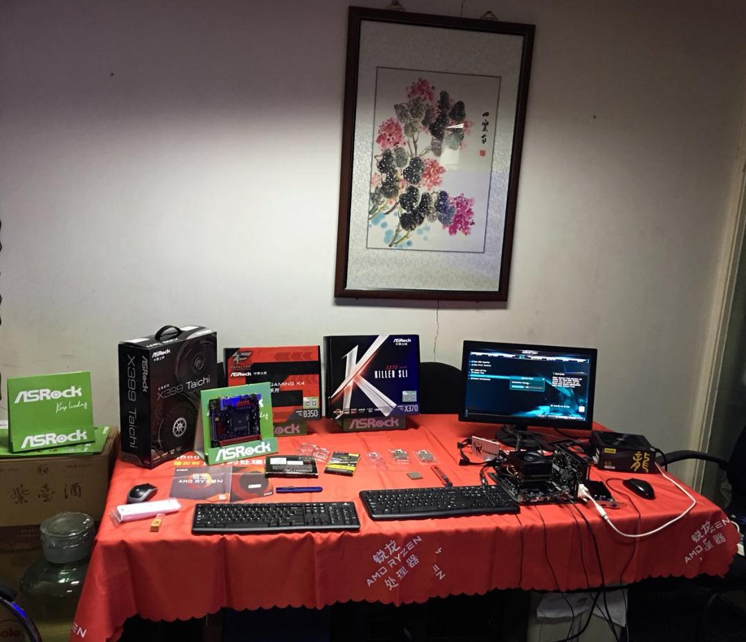会议中间华擎还现场测试A320M-HDV主板并展示了显示全接口和华擎独家功能具有高密度防潮纤维电路板,宝石黑PCB。