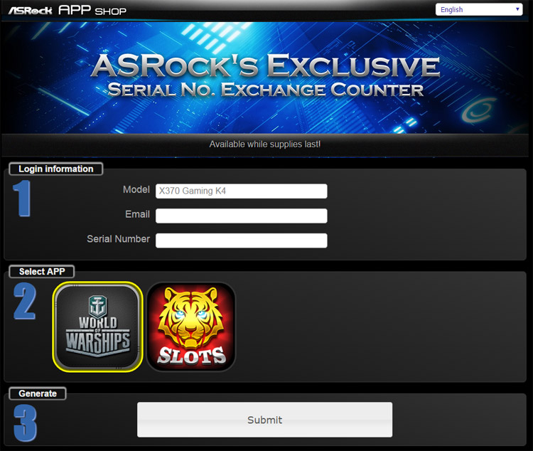 1. Jan. 05, 2017 ~ July. 05, 2017 PM11:59 (GMT+8) 2. Promotion is only available in selected regions of Asia Pacific. 3. To participate this program, please make sure the World of Warships program is installed https://worldofwarships.asia/en/content/game/ 4. Product cannot be refunded once the code is redeemed. 5. This program is available only on ASRock APP Shop. 6. The claim deadline for this promotion is July. 05, 2017 PM11:59 (GMT+8) 7. For any questions regarding this promotion, please contact: appshop@asrock.com.tw 8. About ASRock AppShop: http://www.asrock.com/feature/appshop/index.html |