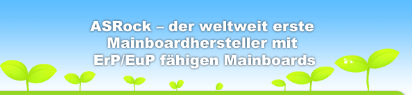 ASRock – der weltweit erste Mainboardhersteller mit ErP/EuP fähigen Mainboards! ASRock ist stolz, bekannt geben zu können, als weltweit erster Mainboardhersteller “ErP/EuP Ready” Mainboards anzubieten . Mit ASRock “ErP/EuP Ready” Mainboards können Sie sicher sein, ein System zusammenzustellen das die ErP/EuP Standards erfüllt. |