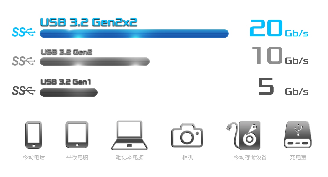 可逆型 USB Type-C 接口设计拥有超快速的数据传输速度,高达 20 Gbps 的数据传输速度是前代产品的2 倍。