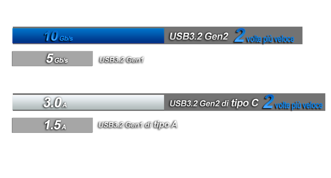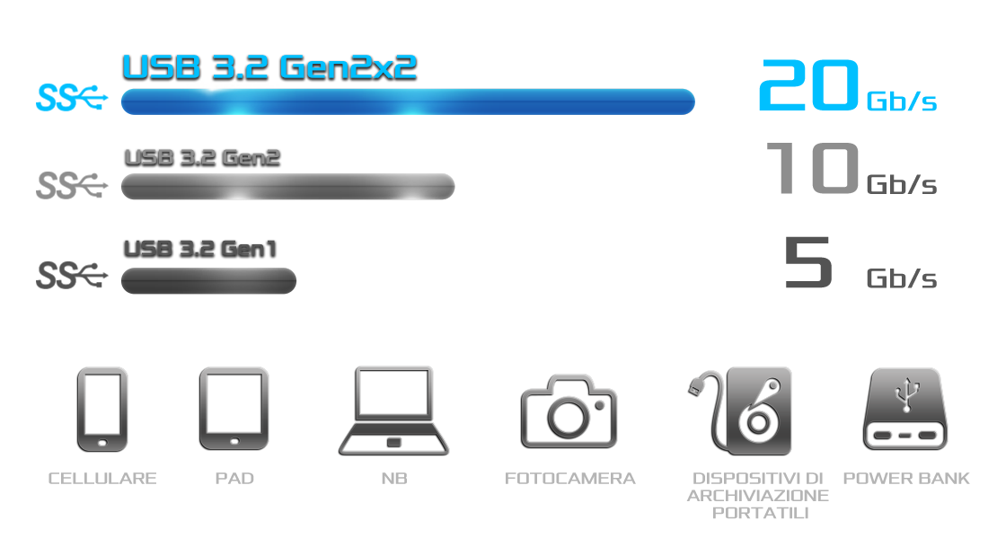 Offre una velocità di trasferimento dati fino a 20 Gbps, che è 2 volte più veloce della generazione precedente, fornendo un'interfaccia di trasferimento dati incredibilmente veloce con design reversibile USB di tipo C.