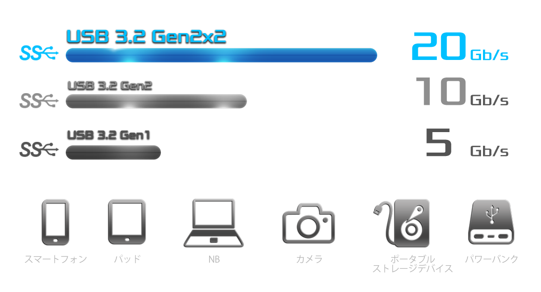 前世代よりも 2 倍高速な最大 20 Gbps のデータ転送速度が、超高速データ転送インターフェースを提供します。リバーシブル USB Type-C 設計です。