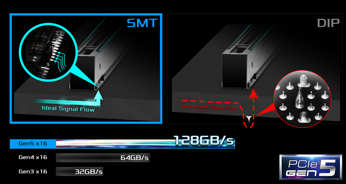 Compares to conventional DIP style PCIe slot, the SMT type PCIe slot improves signal flow and maximize stability under high speed, a key breakthrough to fully support the lighting speed of the latest PCIe 5.0 standard.