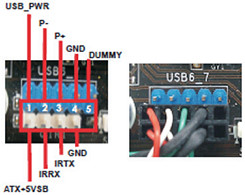 Connect the front USB cable to the USB 2.0 header (as below, pin 1-5) and the CIR header.