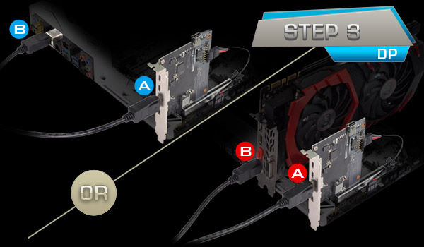 Step3-2. Connect ASRock Thunderbolt 3 AIC with Mini DisplayPort (A) and DisplayPort Port (B) by the supplied Mini DisplayPort to DisplayPort Adapter Cable.