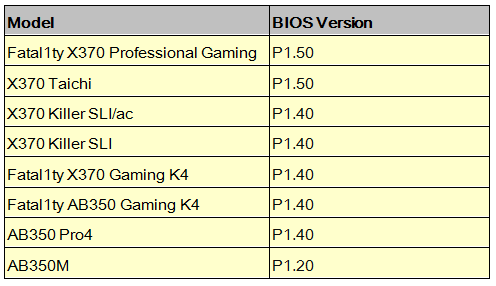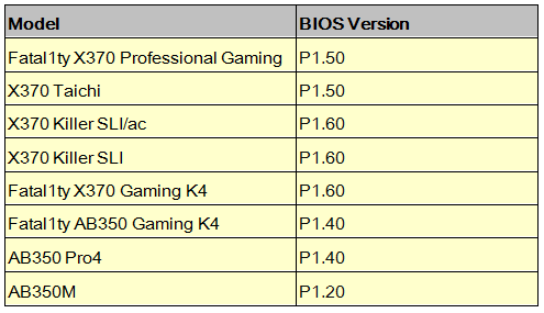 X370 Professional Gaming , X370 Taichi , X370 Killer SLI/ac , X370 Killer SLI ,