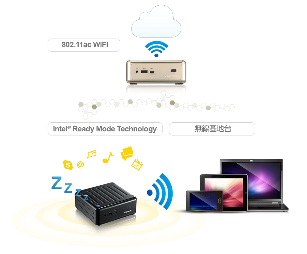 Beebox支援雙頻(2.4 / 5 GHz)無線WiFi技術,同時還可以將它當做高速無線基地台使用。通過 Intel® Ready Mode Technology (RMT),Beebox 能夠維持在顯示器關閉的極低耗電狀態下安靜運行,最省電化的同時仍然可以接收電子郵件、更新 FB 等社交媒體提醒等,而且可以作為一台無線基地台。