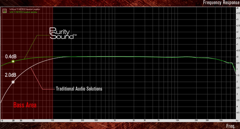 This frequency response chart was tested with 32 ohm normal headphones. It indicates how traditional audio solution’s frequency response drops drastically at low frequencies. Compared to traditional audio solution's (2.0dB) at 20 Hz bass low freq area, Purity Sound™ still maintains its frequency response (0.4dB) and provides better bass with the TI® NE5532 amplifier, improving the bass quality by 20% (1.6dB)! |