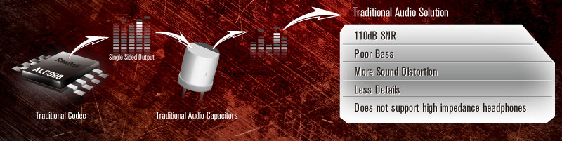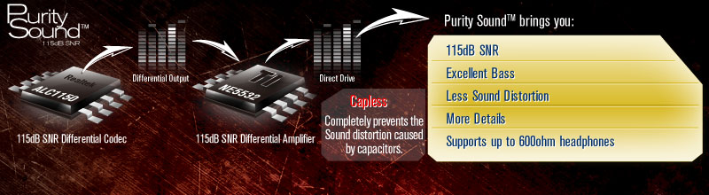 Unlike traditional onboard audio solutions that use single sided output and capacitors, Purity Sound uses a differential codec for differential output, and the signals go through a differential amplifier TI NE5532 with Direct Drive technology, thus providing Purity Sound! |