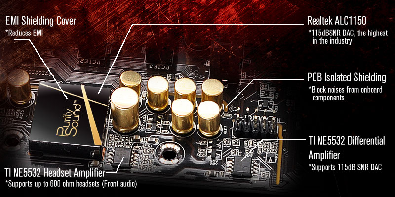 Purity Sound is a combination of several hardware, software audio solutions and technologies that will satisfy even the pickiest audiophiles. Including 7.1 CH HD audio with Realtek ALC1150 audio codec, 115dB SNR DAC with Differential Amplifier, TI® 5532 Premium Headset Amplifier which supports up to 600 ohm headphones, cap less Direct Drive technology, EMI shielding cover, PCB isolate shielding and support for DTS Connect. |