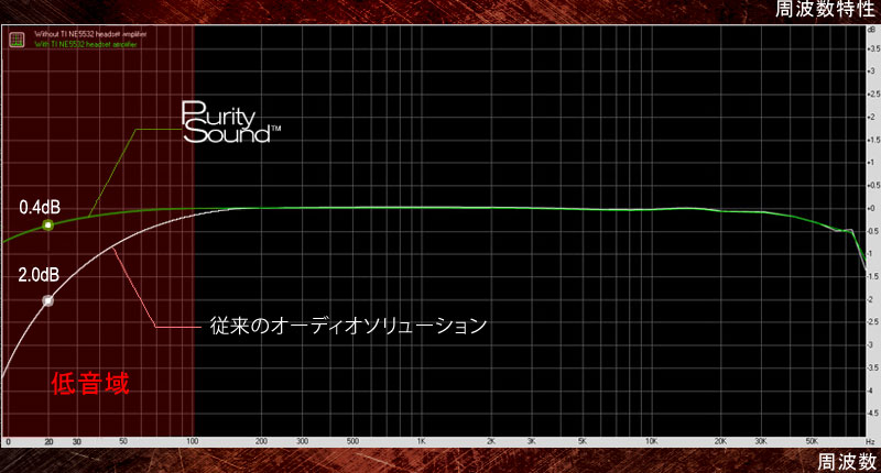 この周波数特性チャートは 32 ohm の負荷で通常のヘッドフォンをシミュレートして試験したものです。従来のオーディオソリューションの周波数特性は低周波数で大幅に低下することが分かります。20 Hz 低音低周波数領域での従来のオーディオソリューション(2.0dB)に対し、Purity Sound™ はその周波数特性を維持して(0.4dB)、TI