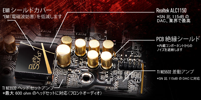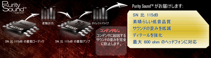 Purity Sound では、いくつかのハードウェア、ソフトウェアオーディオソリューション、そして、技術を組み合わせ、選り好みの多いオーディオマニアの要求でさえ満たします。SN 比 115dB の DAC に対応する Realtek ALC1150 オーディオコーデックを搭載する 7.1 CH HD オーディオ、差動アンプ、最大 600 ohm のヘッドフォンに対応する TI