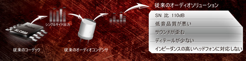 シングルサイド出力とコンデンサを使用する従来の内蔵オーディオソリューションと異なり、Purity Sound では差動出力向けの差動コーデックを使用します。信号はダイレクトドライブ技術を採用した差動アンプTI