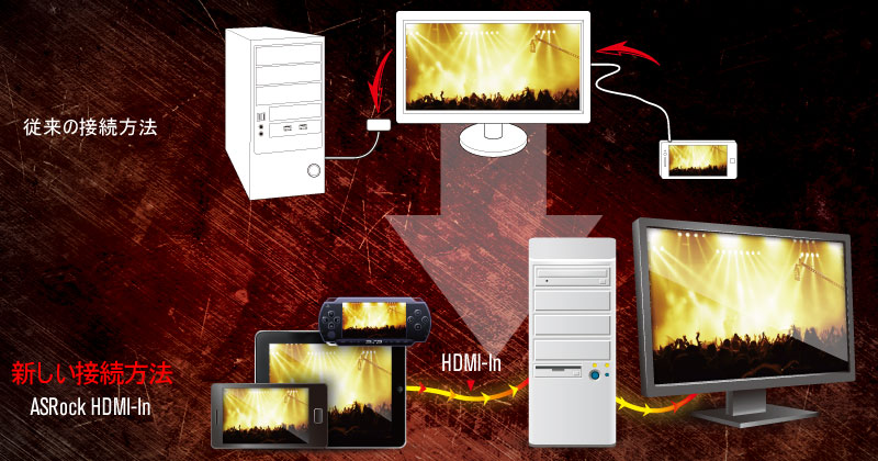 唯一のモニターに接続するためにデバイスを絶えず切り替えることに疲れていませんか? これからは、モニターをマザーボードに接続して、セカンダリーデバイスをマザーボードの HDMI-In ポートに接続するだけです。HDMI-In を使用すれば、コンピュータの画面とセカンダリーデバイスの画面をホットキーで容易に切り替えることができます。さらに、コンピュータの電源を入れなくてもセカンダリーデバイスを使用することもできます。