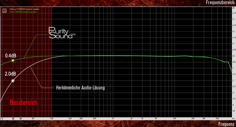 Das folgende Diagramm zur Frequenzabhängigkeit wurde mit einem normalen Kopfhörer mit einem Wiederstand von 32 Ohm aufgezeichnet. Es zeigt, wie der Schalldruckpegel mit traditionellen Soundlösungen bei niedrigen Frequenzen erheblich einbricht. Im Vergleich zu herkömmlichen Soundlösungen, die bei niedrigen Bass-Frequenzen von 20 Hz bis zu 2,0 dB einbüßen, hält Purity Sound den Frequenzdurchgang aufrecht (0,4 dB) und bietet dank des Verstärkers vom Typ TI® NE5532 eine um 20 Prozent bessere Bass-Qualität (1,6 dB)!