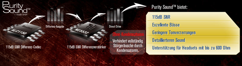 Anders als traditionelle Onboard-Soundlösungen, die eine einstufige Ausgabe und Kondensatoren nutzen, verwendet Purity Sound einen Differential-Codec für eine mehrstufige Ausgabe. Das Signal wandert dabei durch einen Differential-Verstärker vom Typ TI NE5532 mit Direct Drive, womit der pure Soundgenuss Wirklichkeit wird.