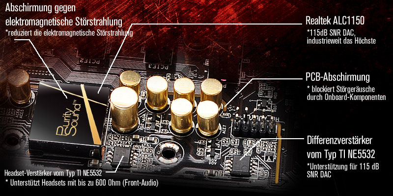 Purity Sound™ ist eine Kombination verschiedener Hard- und Software-Lösungen für die Soundausgabe und bietet Technologien, die selbst die anspruchsvollsten Audiophilen zufriedenstellen werden. Enthalten sind: 7.1 CH HD Audio mit dem Audiocodec Realtek ALC1150, 115dB SNR DAC mit Differentialverstärker, der Headsetverstärker TI® 5532 mit Unterstützung für Kopfhörer mit einem Widerstand von bis zu 600 Ohm, die Technologie Direct Drive, ein EMI Shielding Cover, PCB Isolate Shielding und Unterstützung für DTS Connect.