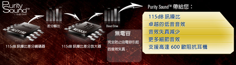 Purity Sound™ 115dB 天籟美聲技術結合多項硬體、軟體音訊解決方案與技術,即便是最為挑剔的音響迷,也能滿足他們的耳朵。包括 7.1 聲道高傳真音效及 Realtek ALC1150 音源編碼解碼器、115dB SNR DAC 及差分放大器、TI