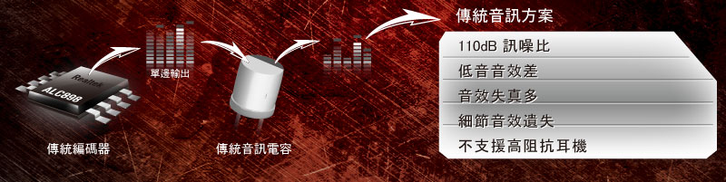 Purity Sound™ 115dB 天籟美聲技術與傳統上採用單邊輸出和電容器的板載音訊解決方案不同,採用差動輸出的差動編碼解碼器,且訊號通過採用直接驅動技術的差動放大器TI NE5532,因此可呈現幾近完美的天籟美聲!
