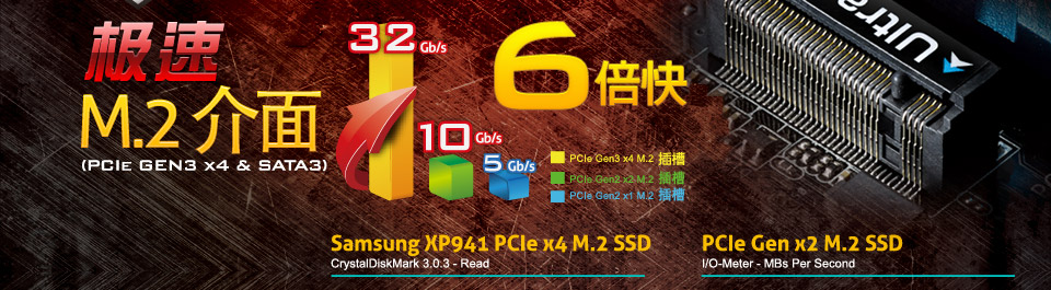 經由華擎工程師所做的 CrystalDiskMark 讀取測試證明,PCIe M.2 介面對 M.2 SSD 的讀取速度比 SATA M.2 介面快 3 倍。 |