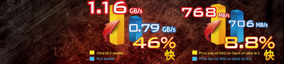 華擎主機板支持 M.2 SATA3 6.0Gb/s 模組與 M.2 PCI Express 模組的讀取速度高達 Gen2 x2 10Gb/s,相較於其他只能跑在 PCI Express Gen 2.0 x1 頻寬的方案比起來, 速度提升 2 倍。將 NGFF SSD 的速度提高到極限,同時減少了大量載入時間並提升整體性能。 |