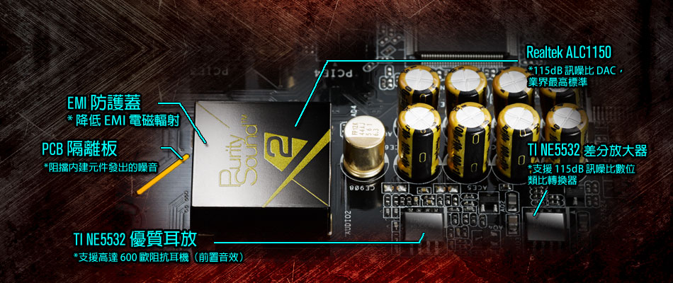 天籟美聲再進化!華擎科技大手筆採用 Nichicon Fine Gold 系列專業音效電容,保證滿足最挑剔的音響發燒友。Realtek ALC1150 音源晶片支援 7.1 聲道高保真 HD 音效,差分放大器支援 115dB 訊噪比數模轉換器,TI® NE5532 優質耳放支援高達 600ohm 阻抗耳機,加上無電容 Direct Drive 技術、EMI 防護蓋和 PCB 隔離板,並支援 DTS Connect,天籟美聲二代提供您更純淨自然的超優質音效饗宴。 |