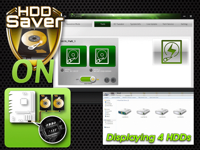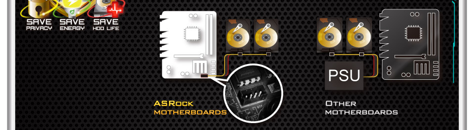 There is a dedicated 4-pin HDD Saver Connector placed near the SATA ports. By connecting it to the HDDs, you can switch on and off the HDDs via software when needed. HDD Saver Technology secures more privacy, saves more energy, and extends the HDDs' life spans.