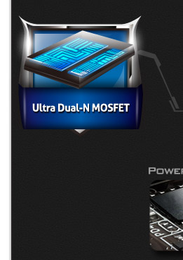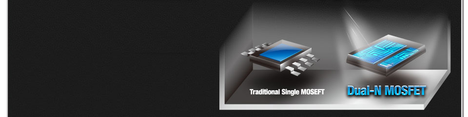 Combining with two silicon dies into one MOSFET, Ultra Dual-N MOSFET provides larger die area and lower Rds(on), so the power supply for the CPU Vcore is more efficient.