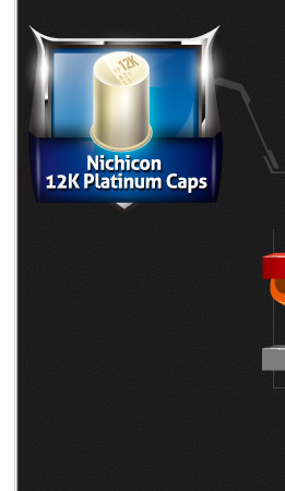 Supreme 12K platinum capacitors with lifespans of at least 12,000 hours. Compared to other counterparts on high-end motherboards that merely have lifespans of around 10,000 hours, ASRock applied Nichicon 12K Platinum Caps that offer 20% longer lifespans and provide more stability and reliability.