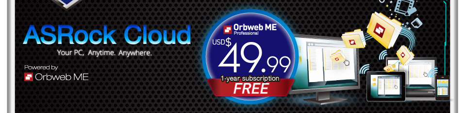 ASRock Cloud* technology makes your mobile devices connect to your PC seamlessly and supports multi devices for accessing File Explorer cloud service simultaneously! We offer a one-year subscription to Orbweb.ME Professional version, a personal cloud service which is $49.99 per year. It allows you to get connected with your PC's files, music, photos, and video clips remotely with tablets anytime, anywhere. Plus an additional one-month upgrade to Orbweb.ME Ultimate package with Remote Desktop function is also available. Now, download Orbweb Me Host, enter ASRock Cloud promotion code "ASR2014B", ASRock's users are allowed to enjoy all services above.