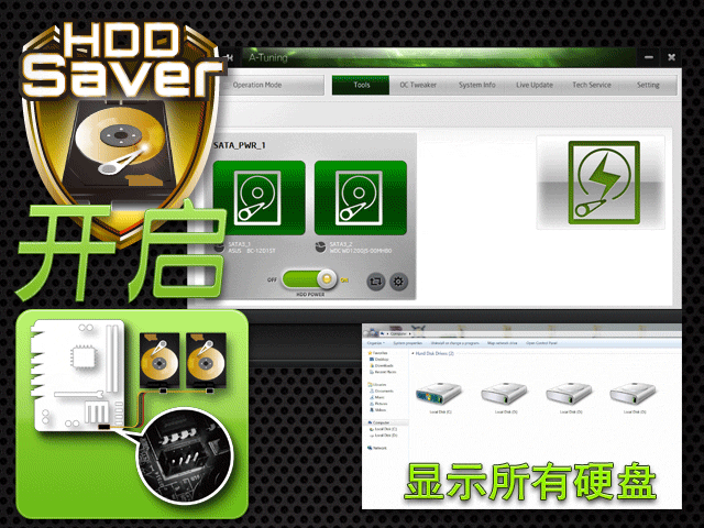 除了系统盘之外,一般人还拥有数颗数据盘,以及不常使用的光驱等等。然而,这些闲置装置非但不断消耗电力,还持续增加系统内部温度。有了「硬盘管家」的环保设计,您可以随时关闭它们的电源,节省更多不必要的能源浪费。而当您有需要时,随时都可以再次启动它们。
