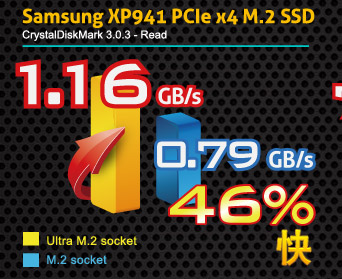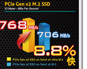 与其它M.2 相比, 超级M.2 直接从CPU支持PCIe Gen3 x4频宽,延迟率更低,速度更快。