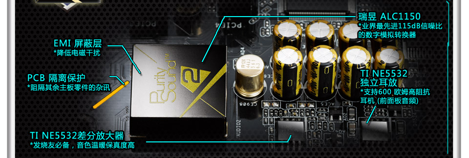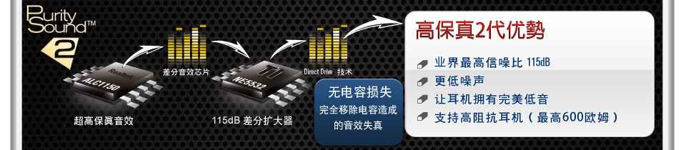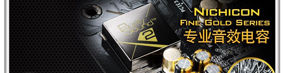 高保真2代技术包括基于瑞昱 ALC1150 音频编译码器的 7.1 声道高保真音频、带差分放大器的 115dB 信噪比数模转换器、无电容直接驱动技术、EMI 屏蔽盖、PCB 隔离屏蔽和 DTS Connect。而 Nichicon Fine Gold Series 专业音效电容可以显著降低噪声水平,甚至可以满足最挑剔音频发烧友的使用需求。