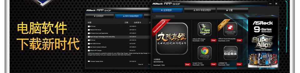 华擎应用市场是您最方便的 BIOS 及软件升级程序, 不定时提供最新版本 BIOS 及各种支持软件供用户下载, 更独家整合多款知名游戏, 让玩家轻松连结游戏世界。华擎这款业界首创新软件「应用市场」, 不仅让玩家可以轻松地维护系统, 让系统随时保持在最新状态, 不必担心软硬件的兼容性问题之外, 还能实时串联最夯电玩, 更可以第一时间了解华擎最新技术, 随时获得最完善的支持服务!中国区最新加入合作的两款重量级游戏分别是来自盛大的《九阴真经》和来自世纪天成的《CSOL反恐精英》,目前这两款游戏已经上线华擎应用市场,与其他众多热门游戏提供的华擎专属礼品包一起等你!