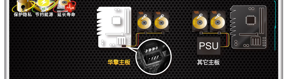 华擎主板在次世代 MOS 区域使用独家设计,可有效抵挡静电伤害,提供比传统 MOS 高 7.5 倍的抗静电保护
