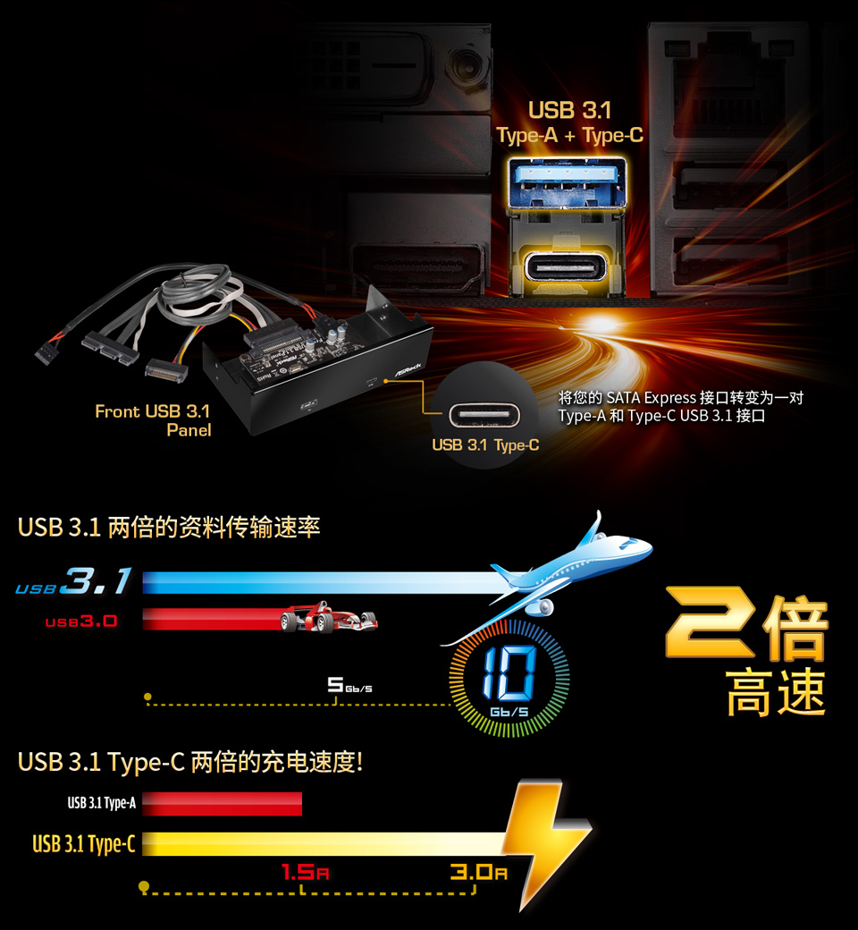 一对 USB 3.1 Type-A 与 Type-C 接口提供高达 10Gbps 数据传输率。Type-C 接口还能提供最高3安培的充沛电力,而且正反双向皆可插的设计,让您可以更方便的使用 USB 设备。
