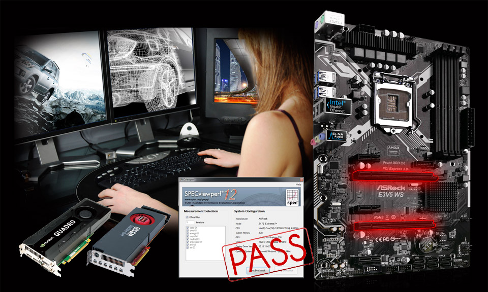 * このマザーボードは NVIDIA® Quadro® および NVS™ グラフィックスカードを使用して SPECviewperf 12.0.2 テストに合格しました。