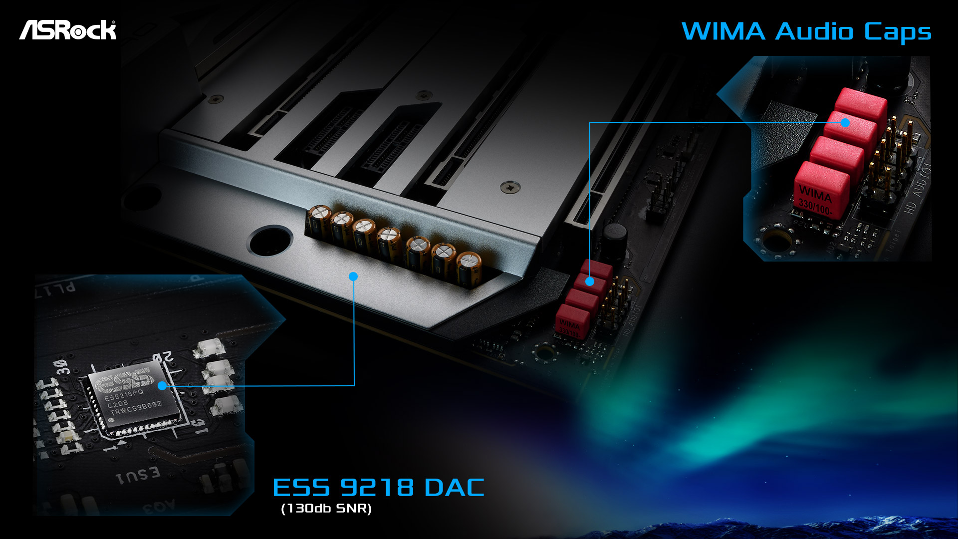 Il DAC ESS9218 integrato offre un vero audio Hi-Fi senza distorsioni, per fornire una qualità audio cristallina, e grazie al THD+N da 112dB è supportata l'impedenza più elevata fino a 600ohm utilizzando le cuffie. I pratici condensatori audio WIMA ottimizzano il suono quando si lavora su applicazioni audio di fascia alta, per soddisfare anche gli audiofili più esigenti. L'esperienza audio Nahimic offre una qualità vibrante e ricca sia che si utilizzino uscite USB, Wi-Fi, analogiche o HDMI sia attraverso l'interfaccia del pannello attivo; gli utenti possono modificare il suono surround, la voce, i bassi e gli acuti in base alle proprie preferenze di ascolto.
