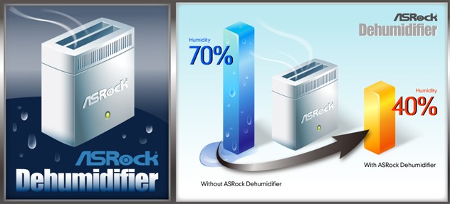 新しく発売されるZ77 Extreme9は最新の除湿機能も備えています。PCの耐用年数にとって最も有害な問題は湿気でしょう。ASRock Dehumidifierは、湿度が決して問題にならないように設計されました。 この除湿装置を有効にすると、S4/S5状態に入ったとき、コンピュータの電源が自動的にオンになり、システムを除湿します。ASRock Dehumidifierを備えたPCは湿気のレベルを約30パーセントの減らすことができます。